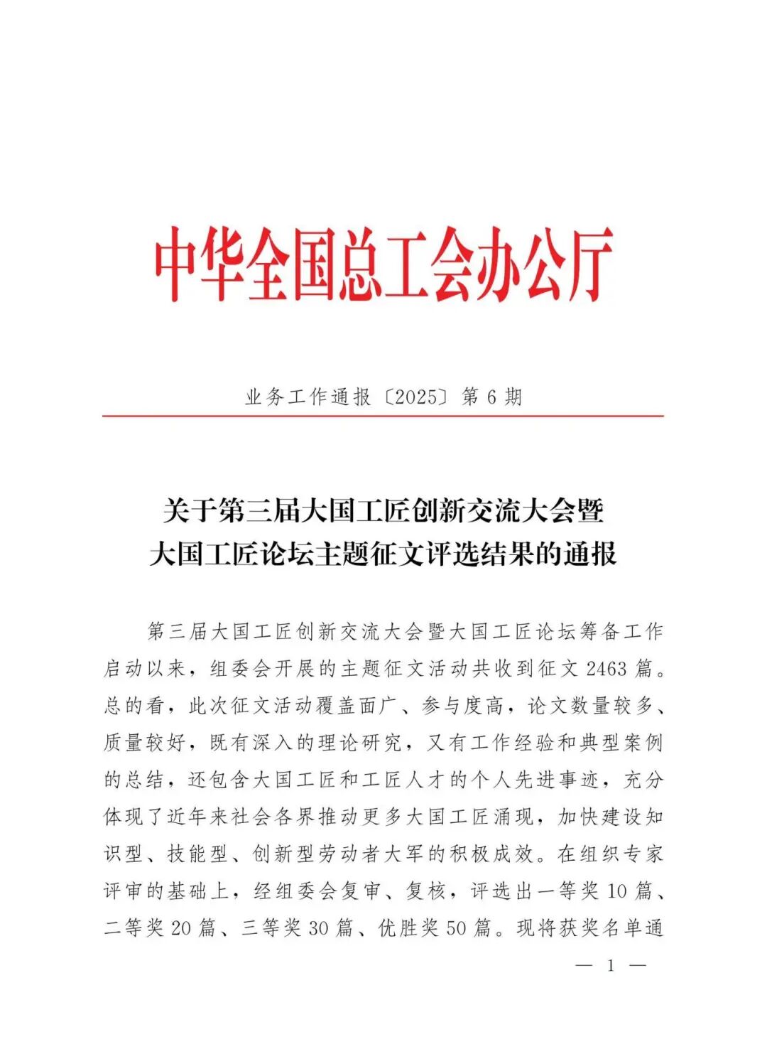 近日,由中华全国总工会主办的第三届大国工匠立异交流大会暨大国工匠论坛在重庆举办。大会集中展示大国工匠和宽大职工在推动高质量生长、生长新质生产力中的卓越孝敬与立异结果,激励亿万职工在中国式现代化建设的伟大征程中再创佳绩。