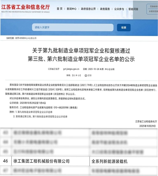 凭据工信部统一安排,江苏省工业和信息化厅宣布《关于第九批制造业单项冠军企业和复核通过第三批、第六批制造业单项冠军企业名单的公示》。