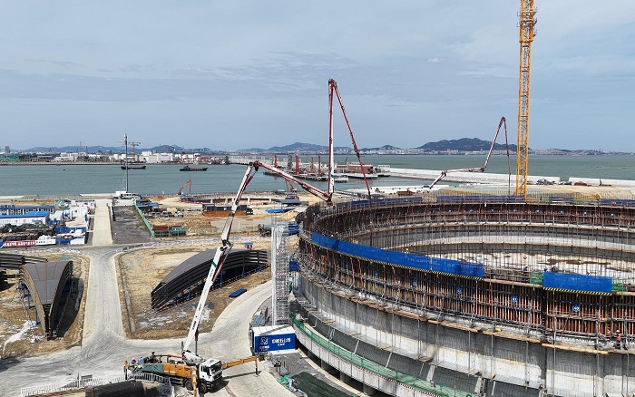 随着各环节建设有序推进,3座22万立方米的LNG(液化天然气)储罐正式进入罐体墙体浇筑。每座储罐高达50多米,相当于18层楼高度,海风裹挟的高湿度情况,给高空作业难度层层加码!