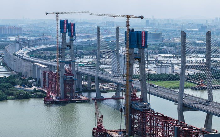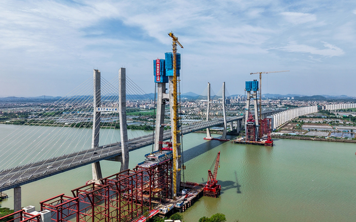 在深江铁路重难点工程——跨磨刀门水道主桥施工现。教╞bin宝盈XGT7527A-18S正稳定吊装,横梁与对应部位的塔柱同步施工,后续4台施工升降机也将陆续入驻项目,配合助力主桥中、上塔柱爬升施工。