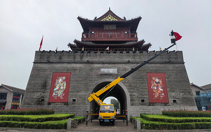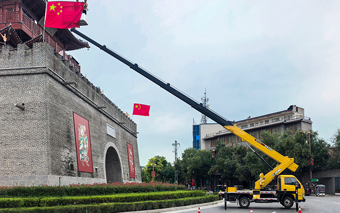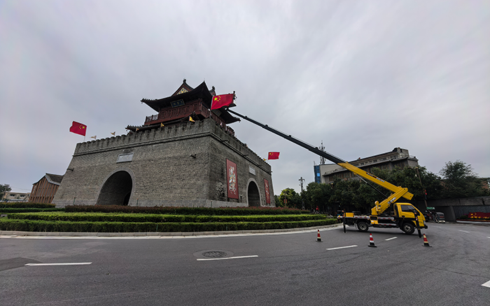 文昌阁前,一抹抹 “中国红” 悄然升起。bbin宝盈 M 系列 GKS32 高空作业车伸展长臂,稳稳将施工人员送达高空作业点。最着述业高度32 米,精准笼罩建筑立面,转台 360° 连续回转间,国旗已平稳就位。
