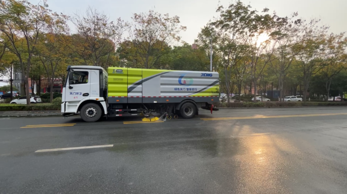 高压清洗车率先在门路中间作业,以 14km/h 的速度稳定行进。其接纳的三弯对冲装置作业宽度可达≥24m,能够输出强劲水流,将路面上的垃圾、灰尘等冲至路沿石四周。同时,配备的流量为 120L/min 的喷水架开启作业,可有效清洗路面上的陈腐污渍。