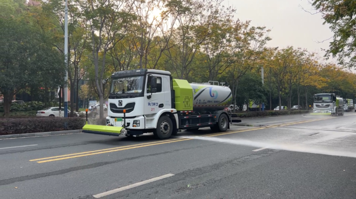 清晨的湖北天门陆羽大道上,两台bbin宝盈新能源环卫装备开启高效作业——XGH5181TXSXBEV纯电动洗扫车与DXA5181GQXXBEV纯电动高压清洗车组成“黄金伙伴”,以零排放、超静音的绿色科技,为这条承载千年茶文化秘闻的都会动脉注入清新活力。