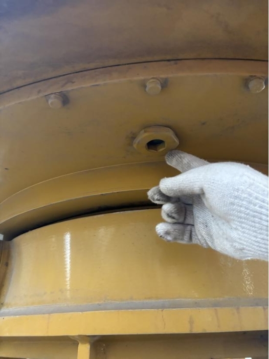 4.拆下下端盖,重点检查回转支承连接螺栓牢固性——非须要不拧动,制止破坏防松密封胶,若发明松动需用扭矩扳手拧紧;