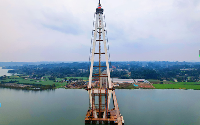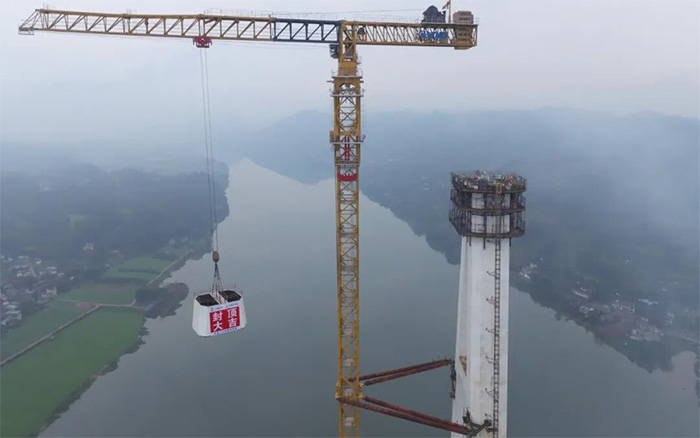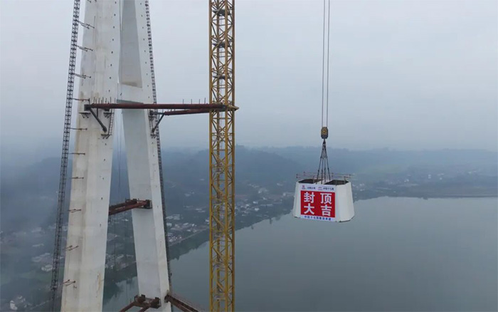湖岷江特大桥主塔接纳六边形箱型截面,结构庞大,高空作业宁静危害大,XGT2850-120S为大桥?榛醋疤峁┝艘χС。