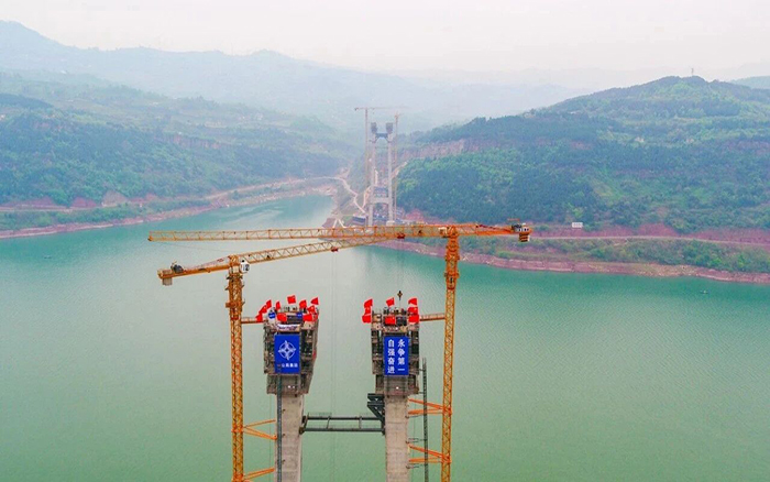 作为海内山区首座PPP模式下实施全生命周期BIM+技术的千米级特大桥,高度为177.5米的钢筋混凝土主塔,相当于60层楼的高度,耸立于长江两侧。晴雨莫测、阵势庞大、施工高度高、昼夜施工不间断作业……一系列庞大的施工条件,其施工难度不言而喻,关于塔机的各项性能都是极大的考验。